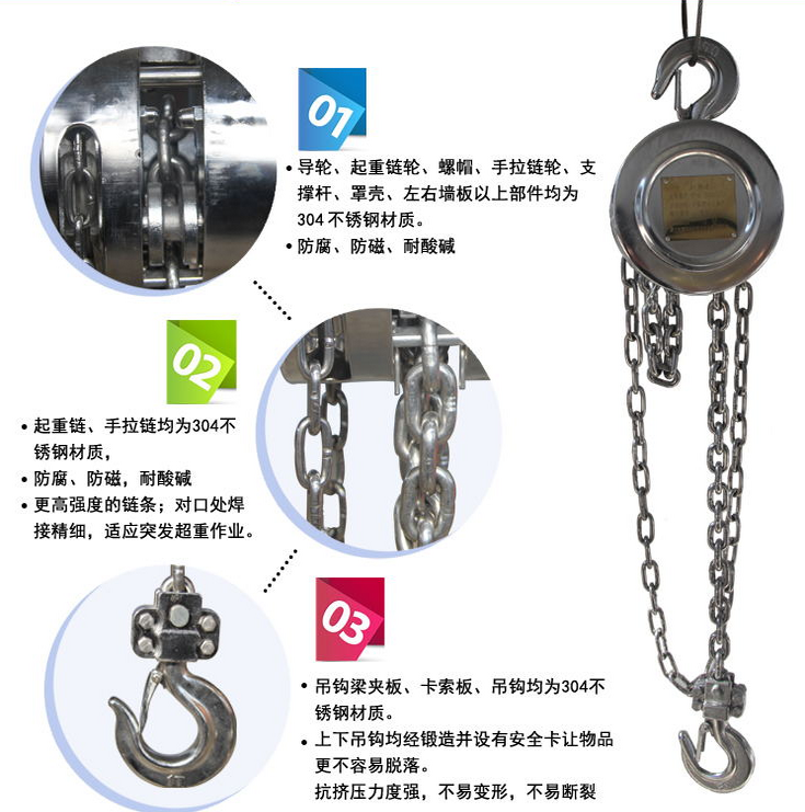 304材質不銹鋼手拉葫蘆0.5噸--20噸是一種常見的民用起重設備,用途廣泛,具有輕巧便于攜帶、耐腐蝕、耐磨損等住所優勢。